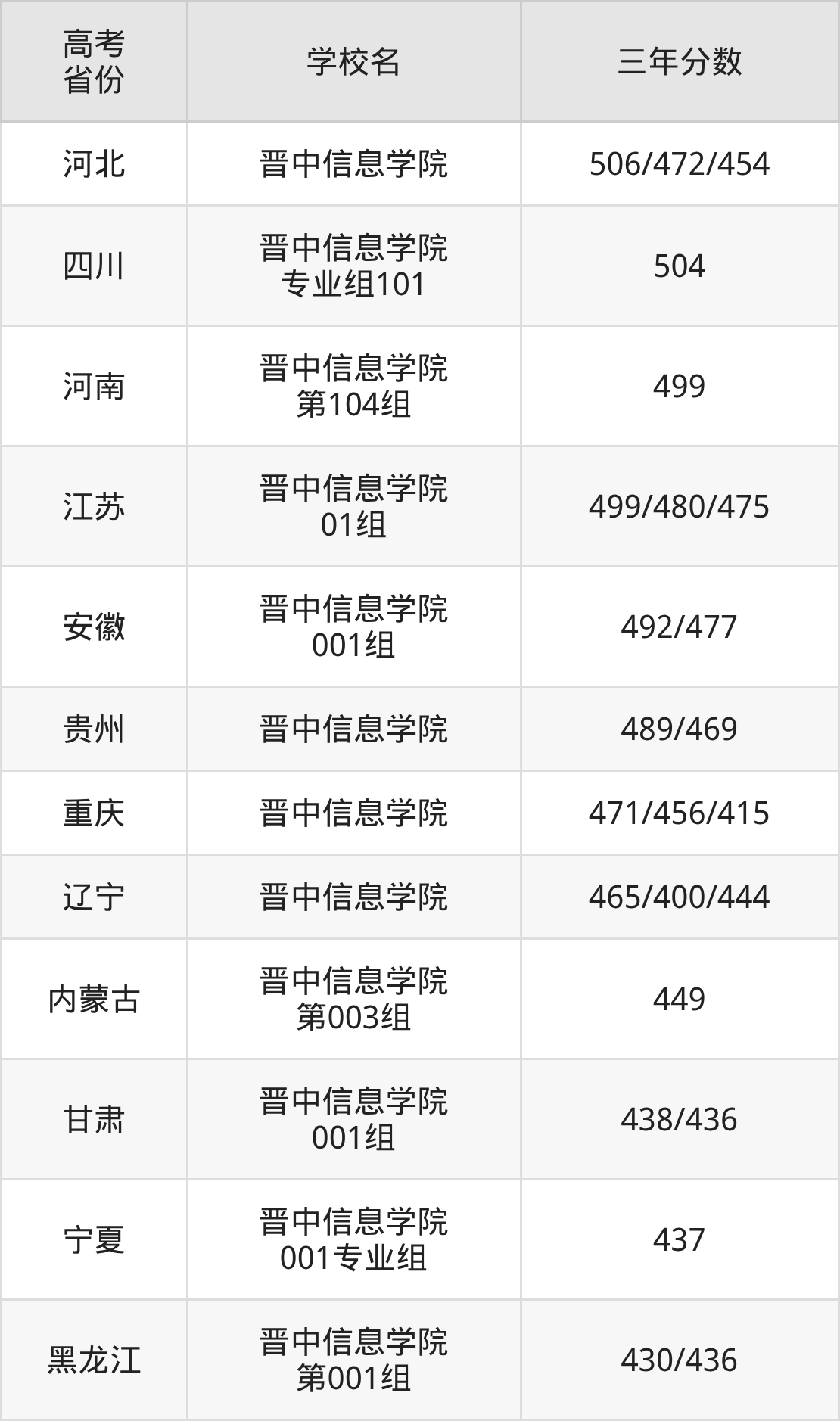 | 重庆 | 晋中信息学院 | 449/454/444 |