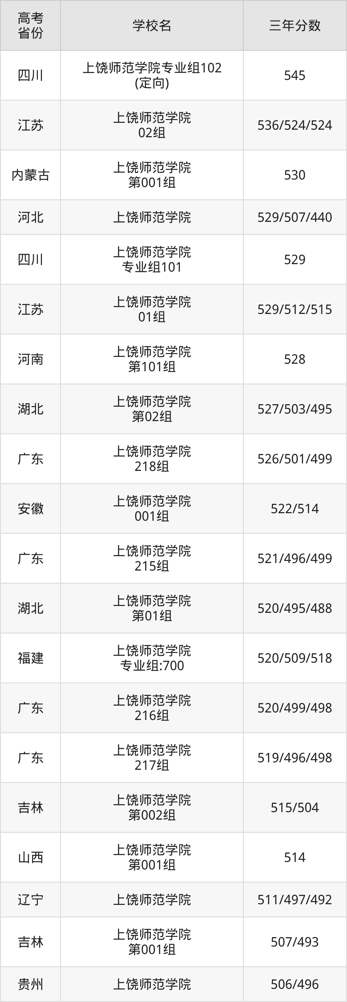 | 河北 | 上饶师范学院 | 503/488/478 |