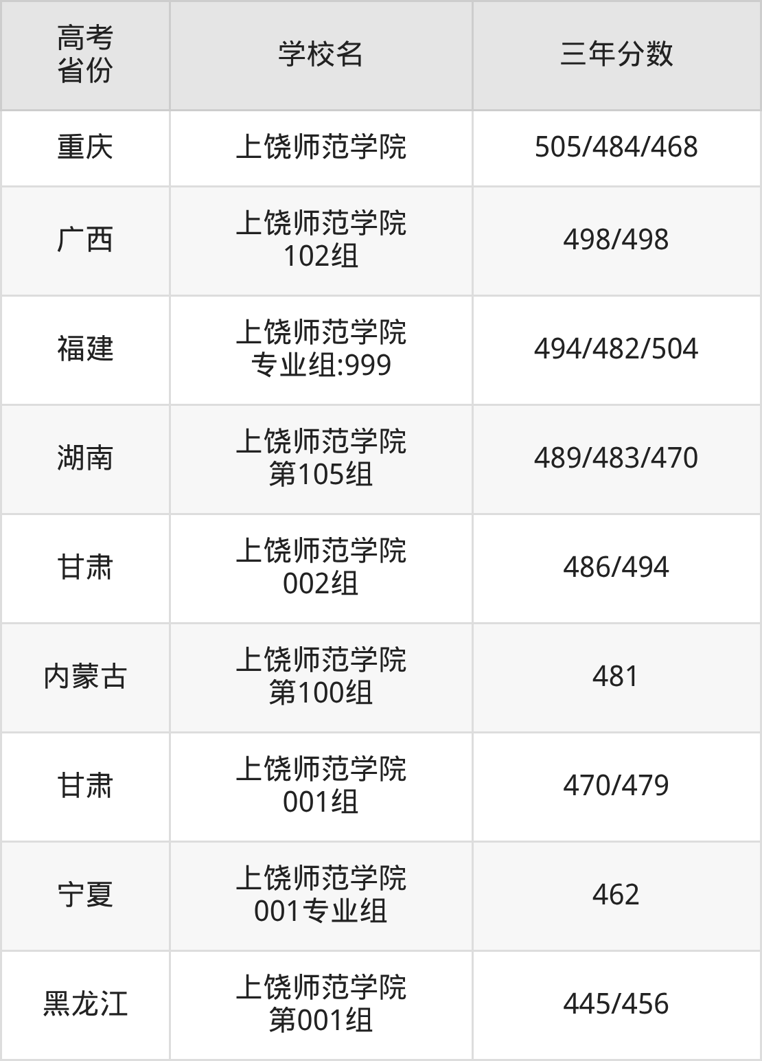 | 重庆 | 上饶师范学院 | 484/495/451 |
