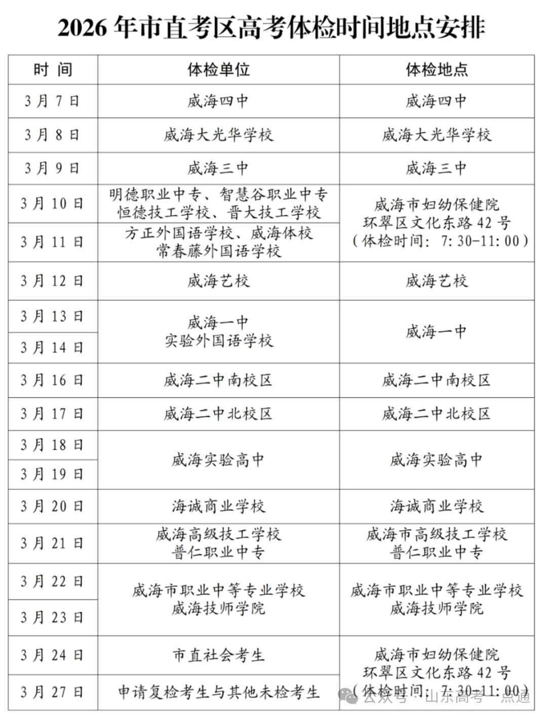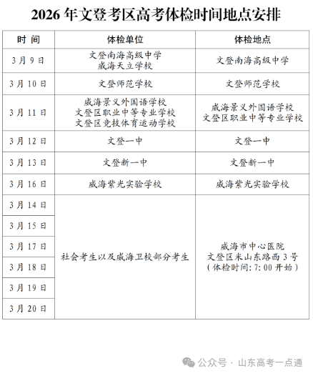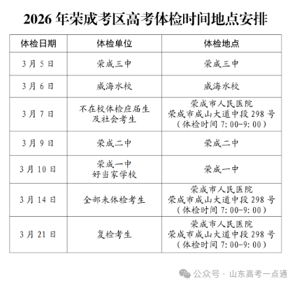 全市体检时间由各学校安排,社会考生需关注当地招办通知(威海招办:0631-5811069;日照招办:0633-8779718)。