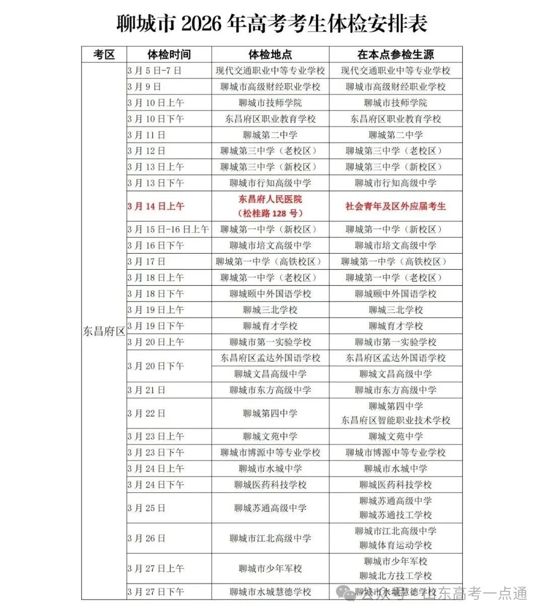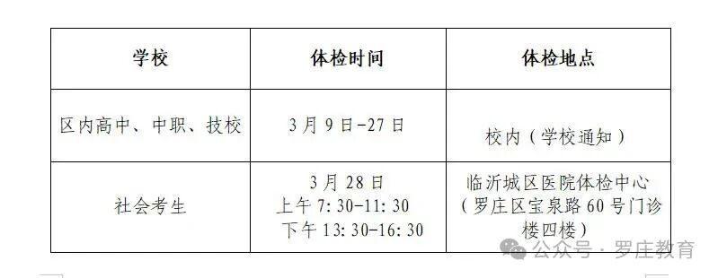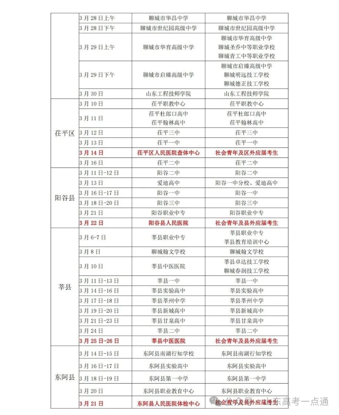 全市体检时间由各学校安排,社会考生需关注报名地招办通知(如东昌府区招办:0635-8418118)。