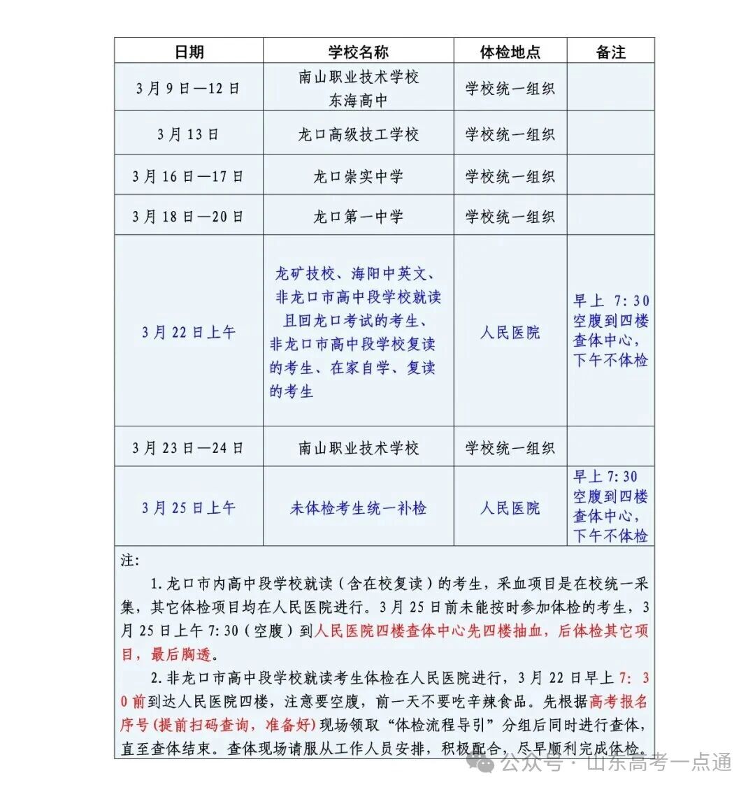 海阳市/龙口市/栖霞市:社会考生分别在3月6/10日、3月22日、3月6/10日在当地人民医院体检(如龙口市人民医院四楼查体中心),需带身份证、微信缴费;