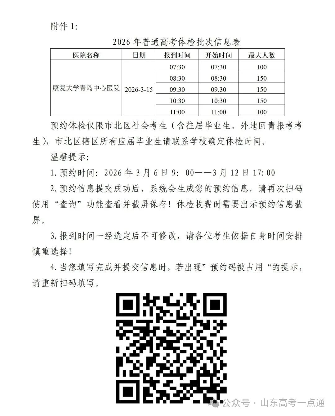 市北区:社会考生需提前扫描二维码预约,3月15日在康复大学青岛中心医院(四流南路127号)体检,需带身份证、手机缴费;