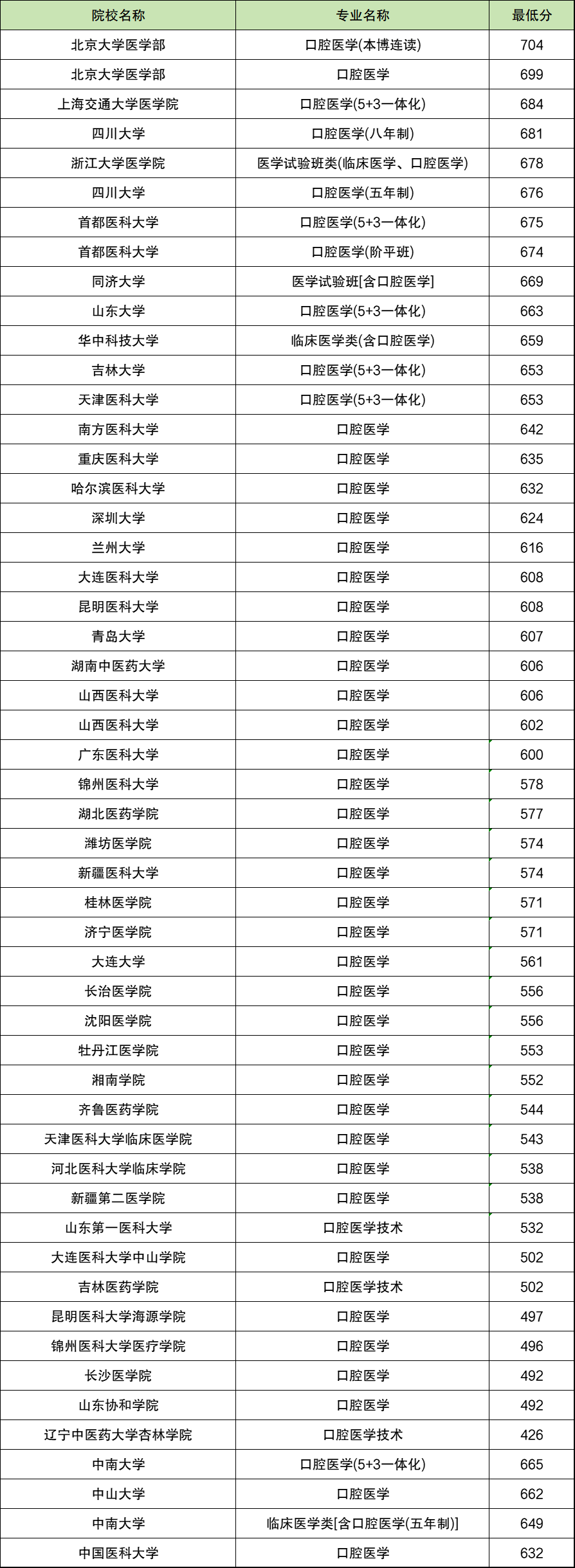 比如北京大学医学部口腔医学(本博连读)是704分,普通的口腔医学专业是699分;上海交通大学医学院口腔医学(5+3一体化)的分数是684分;四川大学口腔医学(八年制)是681分、口腔医学(五年制)是676分。