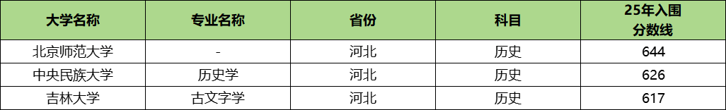 小编为大家统计了已经公布了2025年入围分数线的强基计划各大学在河北省历史类的招生数据。例如:中央民族大学的历史学专业,2025年河北历史类的入围分数线是626分。