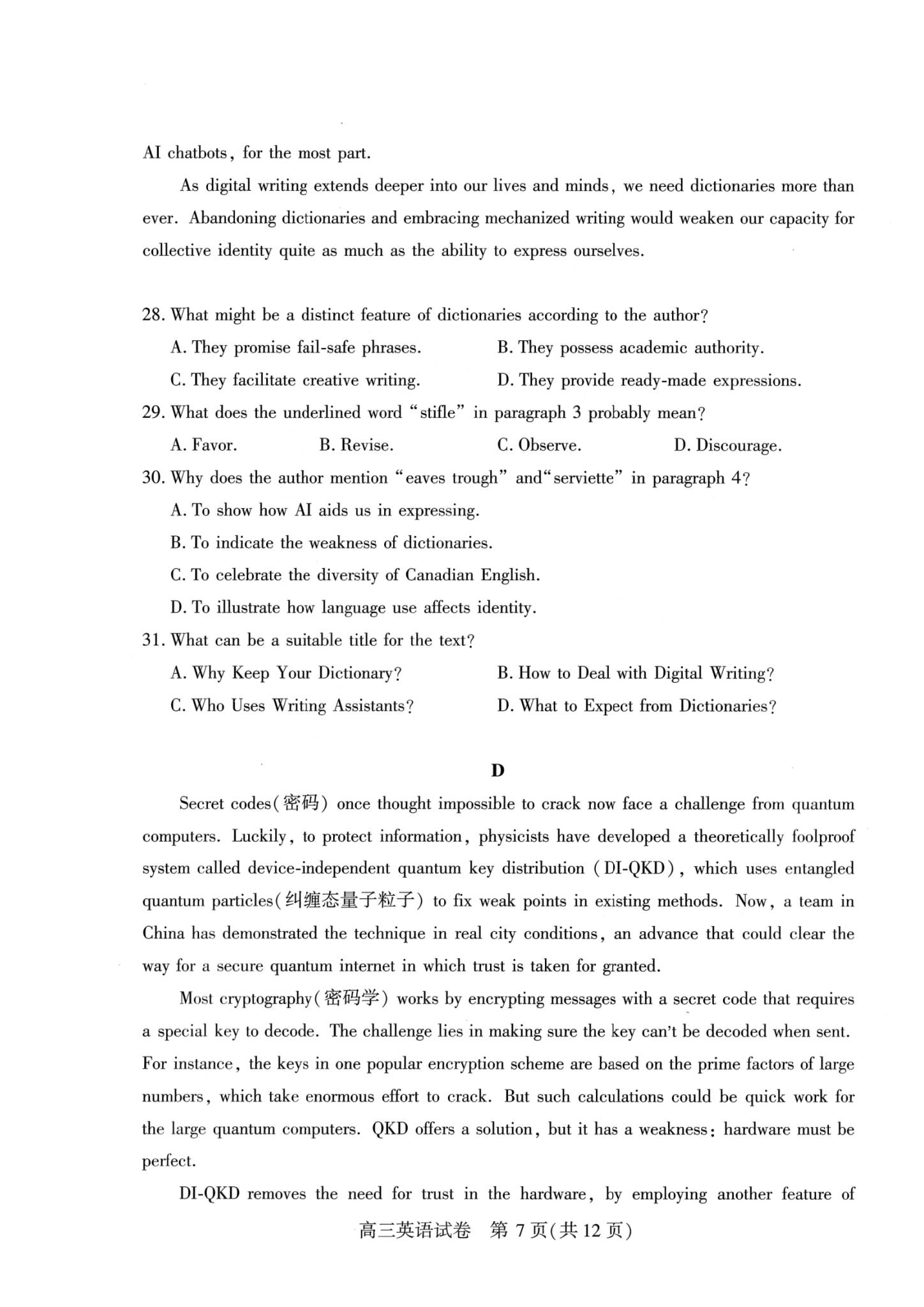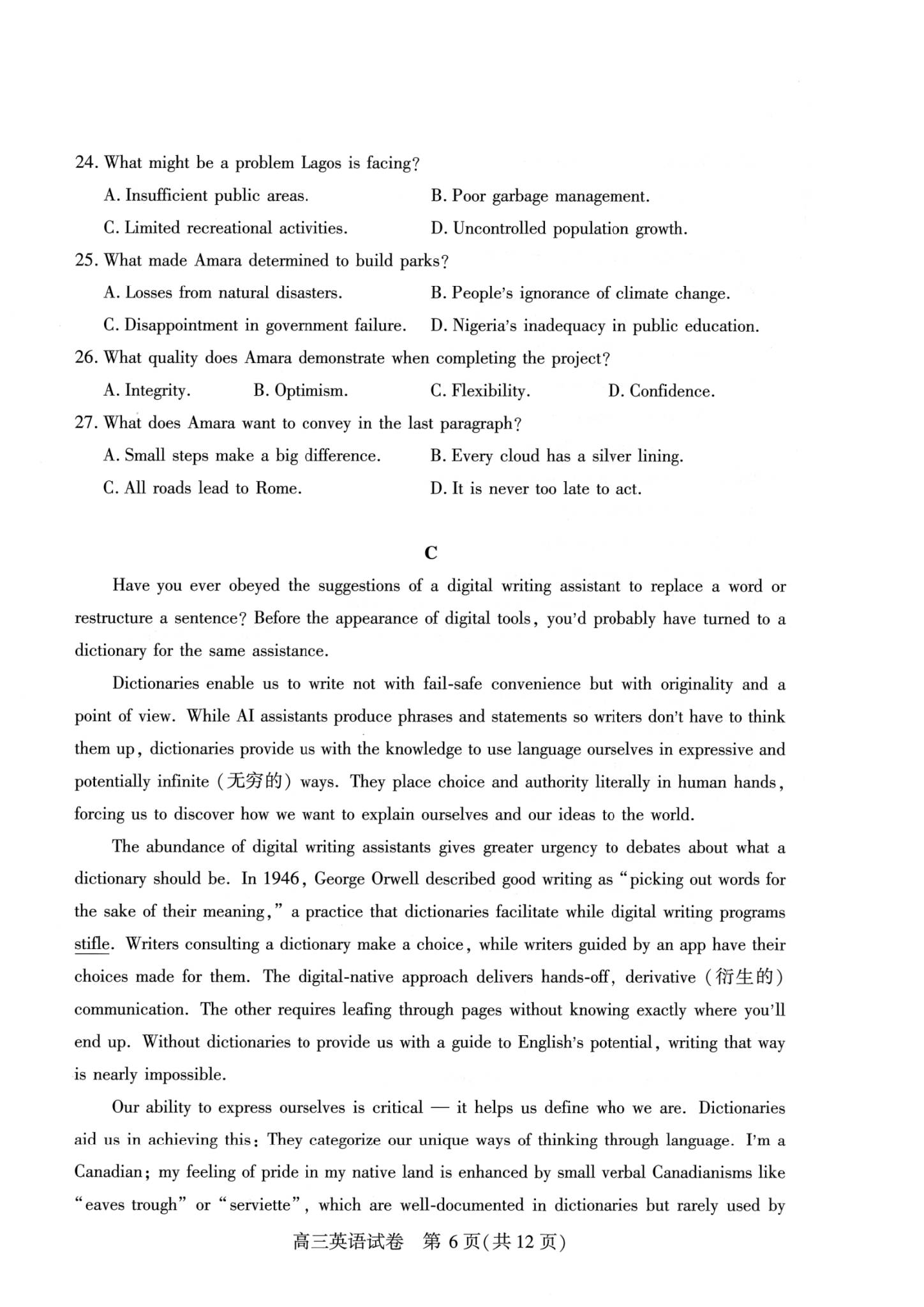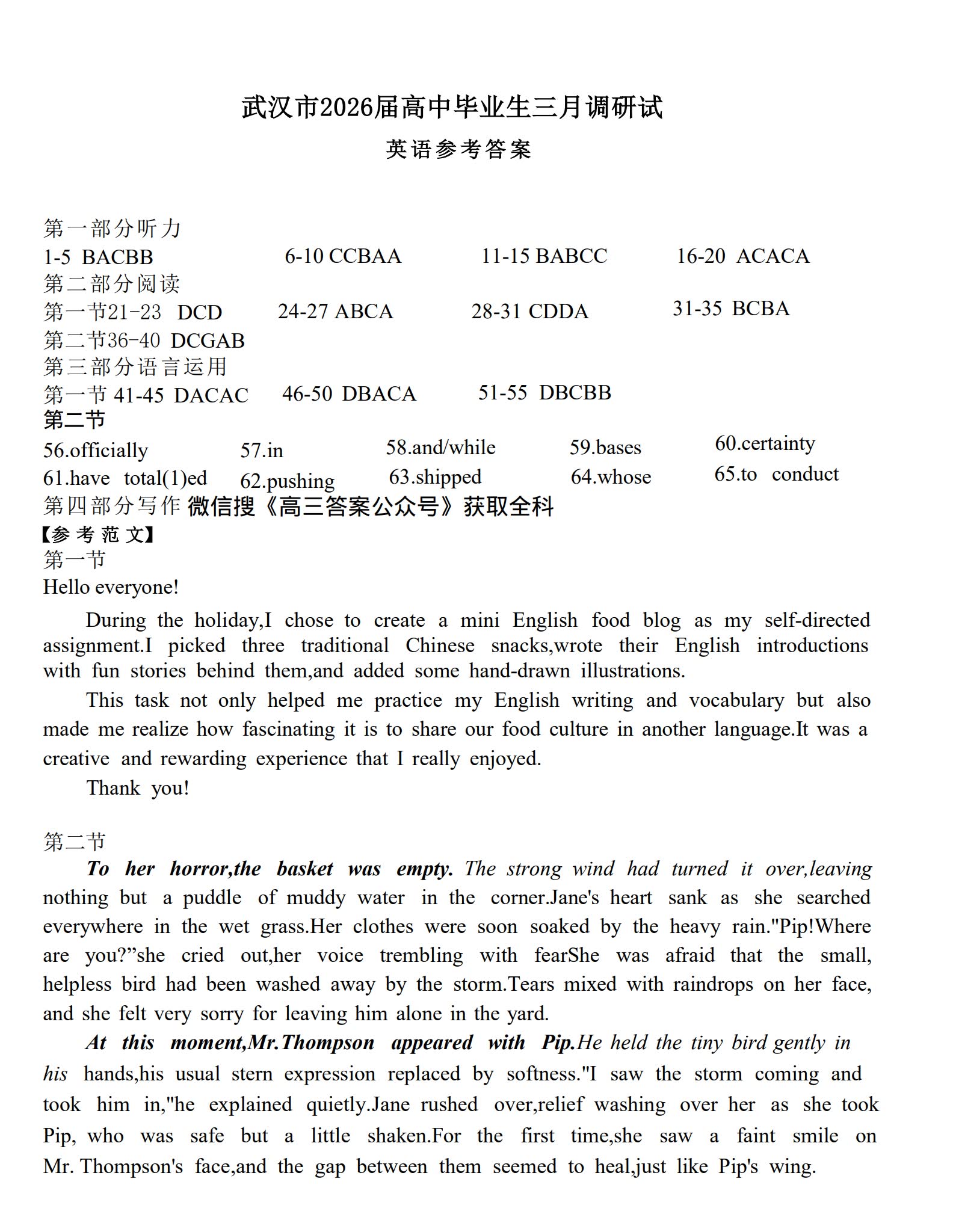 五、2026武汉高三二调英语试卷及答案