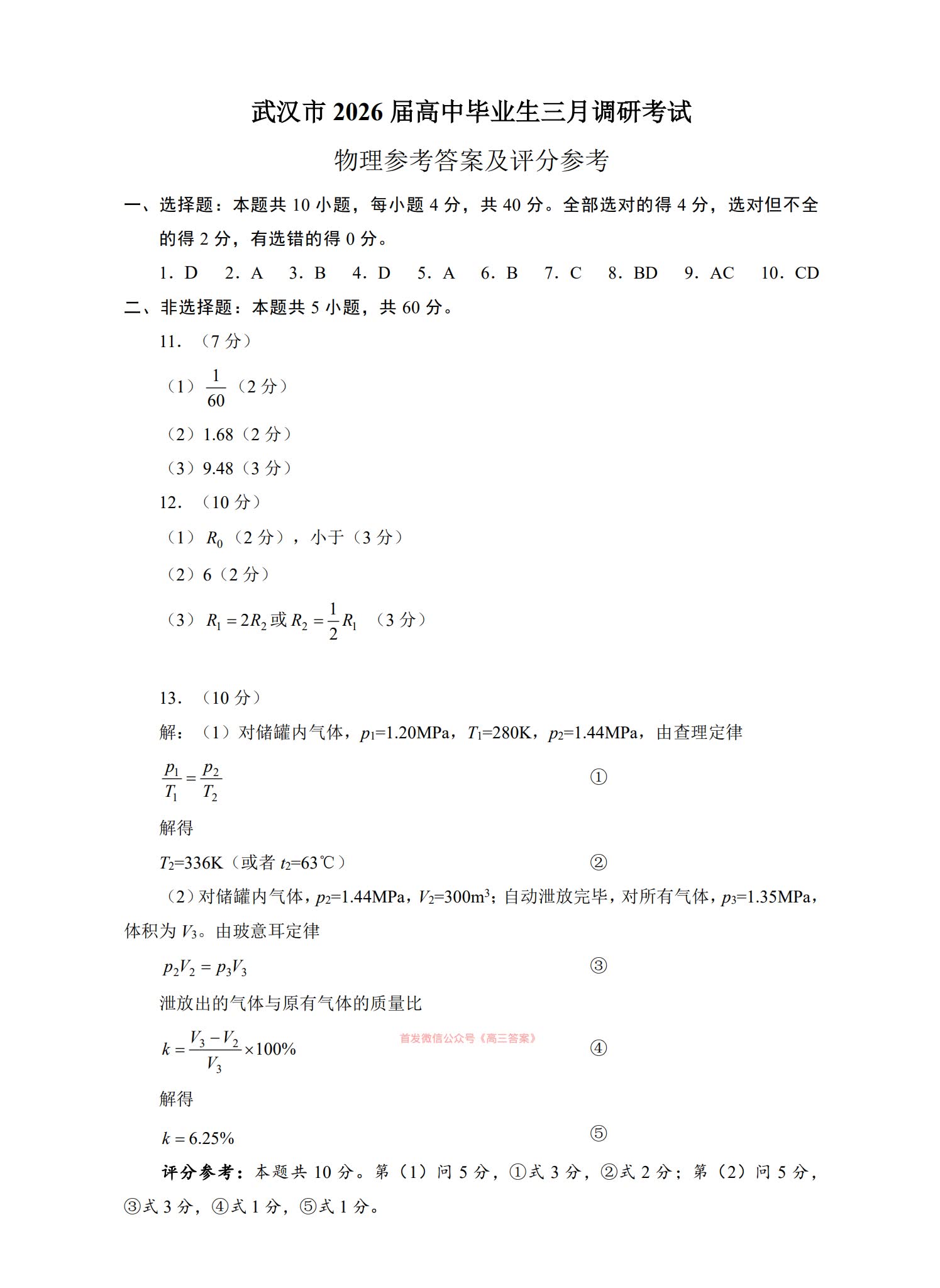 三、2026武汉高三二调物理试卷及答案