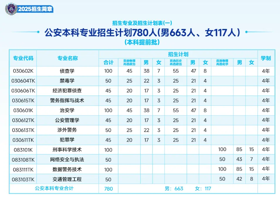 2025年学院计划招收公安本科专业780人,其中男生663人,女生117人,延续公安院校男生为主的传统。以下是分专业招生人数: