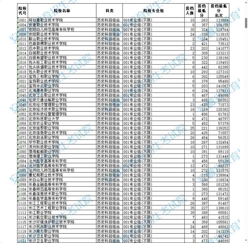 安徽省2025年普通高校招生普通高职(专科)批院校投档最低分及名次(历史科目组合)