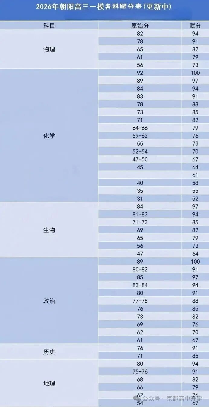 朝阳区也公布了初步的赋分对应表,这对理解选考科目的成绩转换有重要参考价值。赋分制旨在消除科目难度差异,使分数更具可比性。