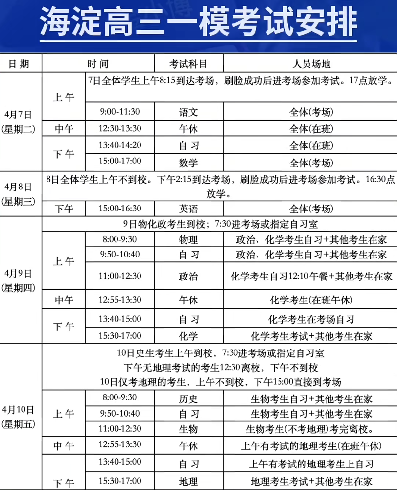 时间安排与东城区基本一致:4月8日语文+数学,4月9日英语,4月10日物理+政治+化学,4月11日历史+生物+地理。