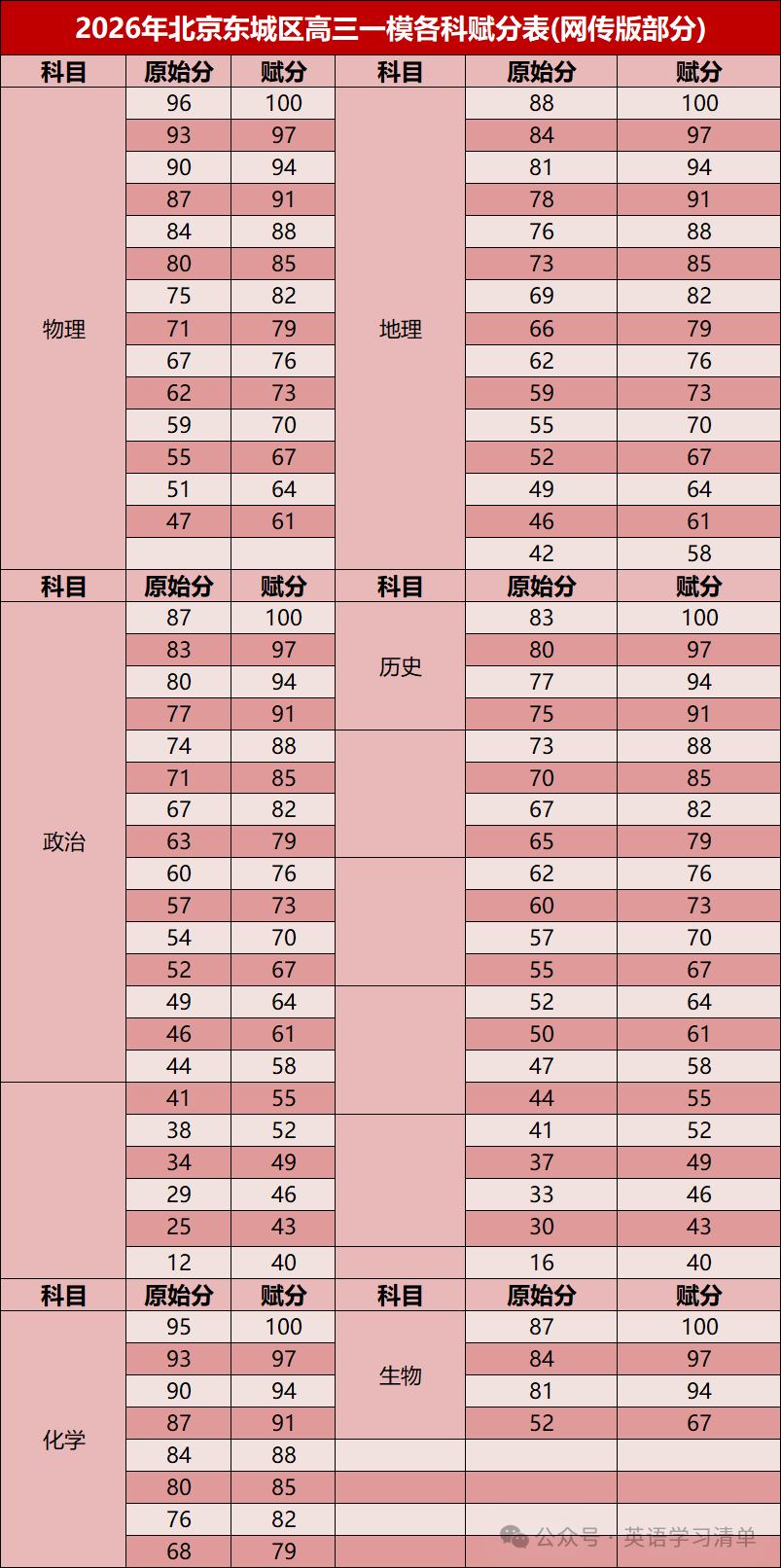 生物、政治、历史、地理等科目也均有对应的赋分区间。例如,历史原始分89分可赋至100分,地理原始分76分可赋至91分。