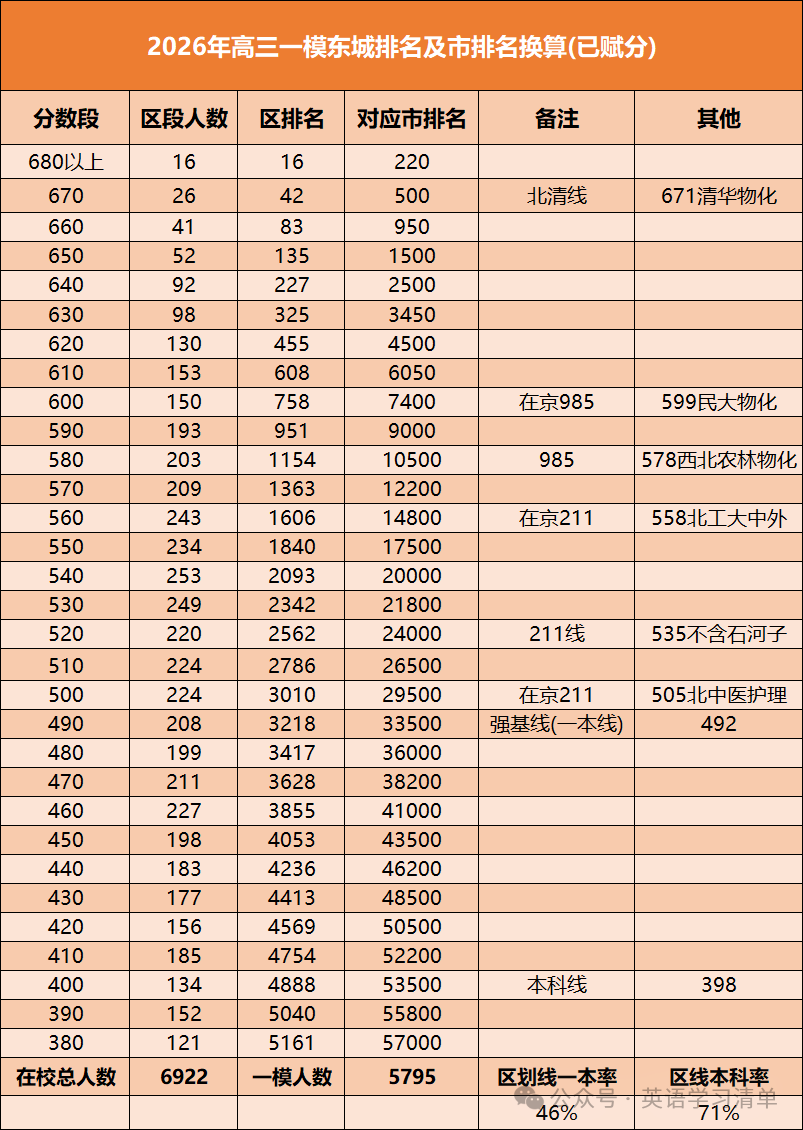 东城区排名及市排名换算(供参考)
