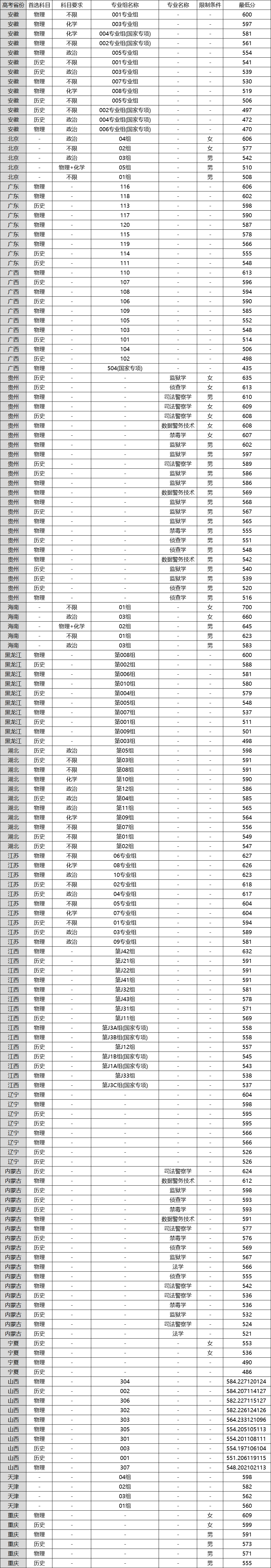 物理类:司法警察学(男)610分;司法警察学(女)609分;数据警务技术(女)608分;监狱学-心理矫治方向(男)602分