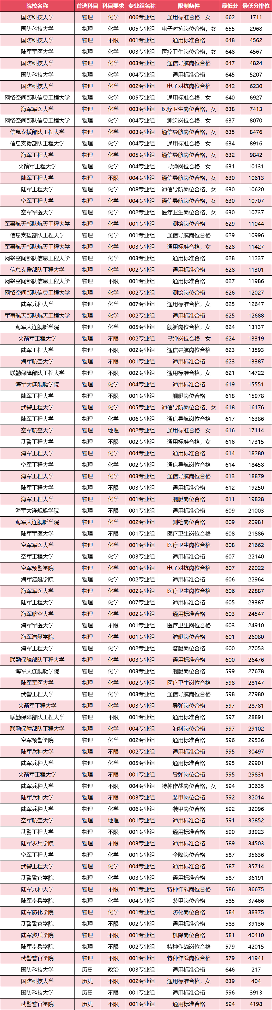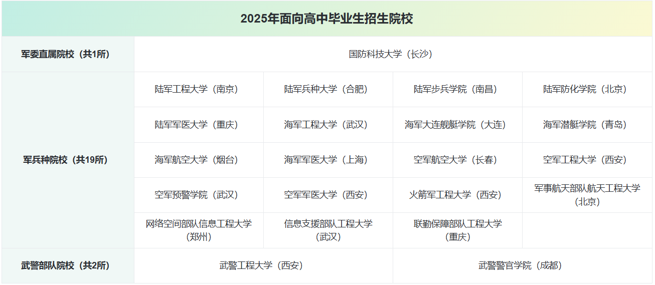 说明:各军校下设多个专业组,对应不同军种、岗位与培养方向。考生报考时须仔细查阅当年招生计划,根据选科、性别、身体条件及岗位要求合理选择。