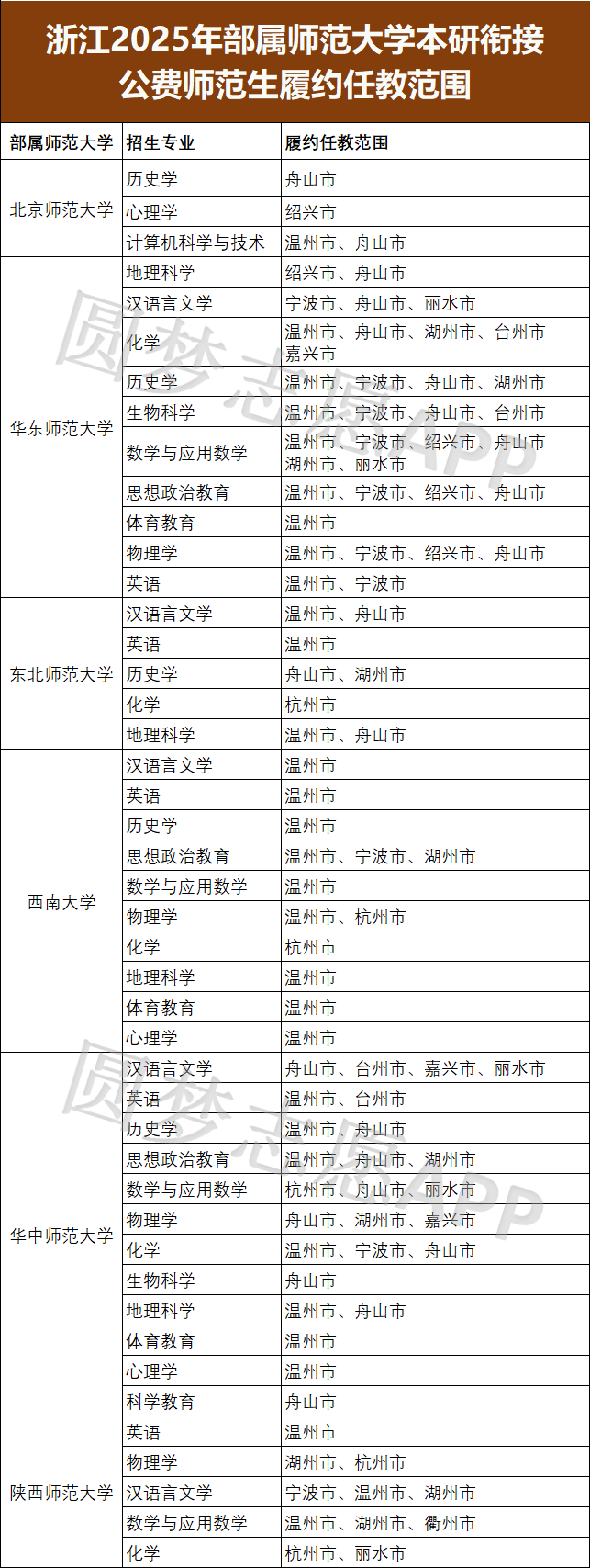 以下为2025年浙江国家公费师范生(部属师范大学本硕衔接)履约任教区域整理,2026届考生在选择院校和专业时可重点参考。