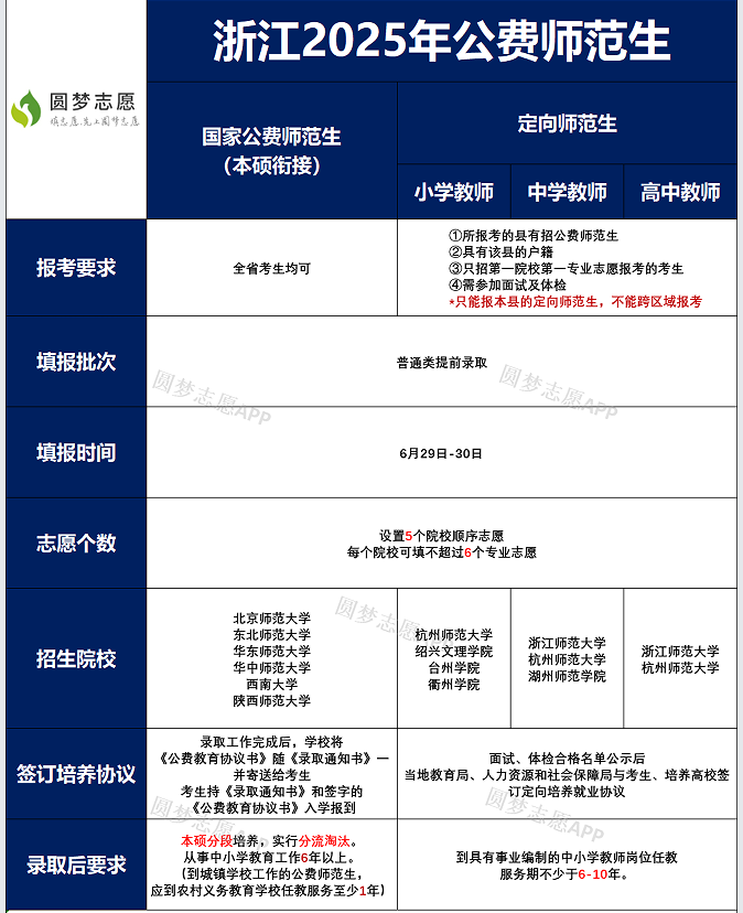考生被录取后需与高校签订《公费教育协议书》,实行本硕分段培养并设分流淘汰机制。毕业后须在浙江省内中小学从事教育教学工作不少于6年。其中,安排至城镇学校任教的毕业生,需至少有1年在农村义务教育学校服务。