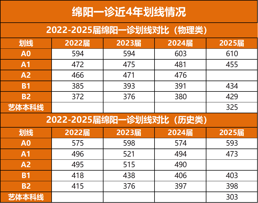 从近四年的数据来看,绵阳一诊划线在历史类和物理类均呈现一定波动,反映了高考命题趋势和考生整体水平的变化。以下是2022年至2025届绵阳一诊的划线情况: