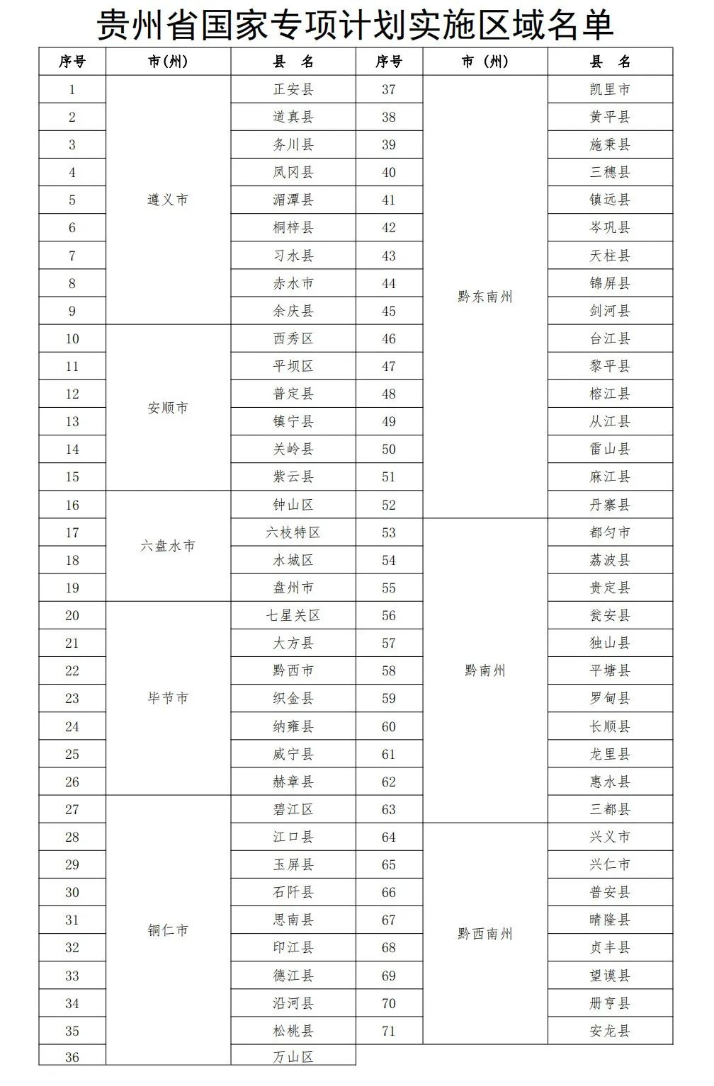 根据近年公布的实施范围,贵州国家专项计划实施地区预计仍覆盖全省以下71个县(市、区):