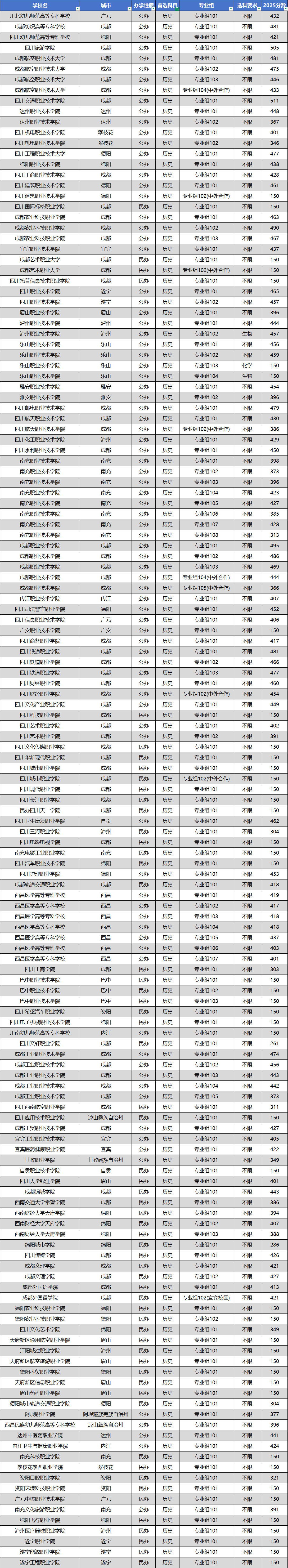 根据2025年四川省教育考试院公布的专科批投档数据,公办与民办院校分数差距明显。以下是物理类、历史类中分数较高的部分公办院校情况: