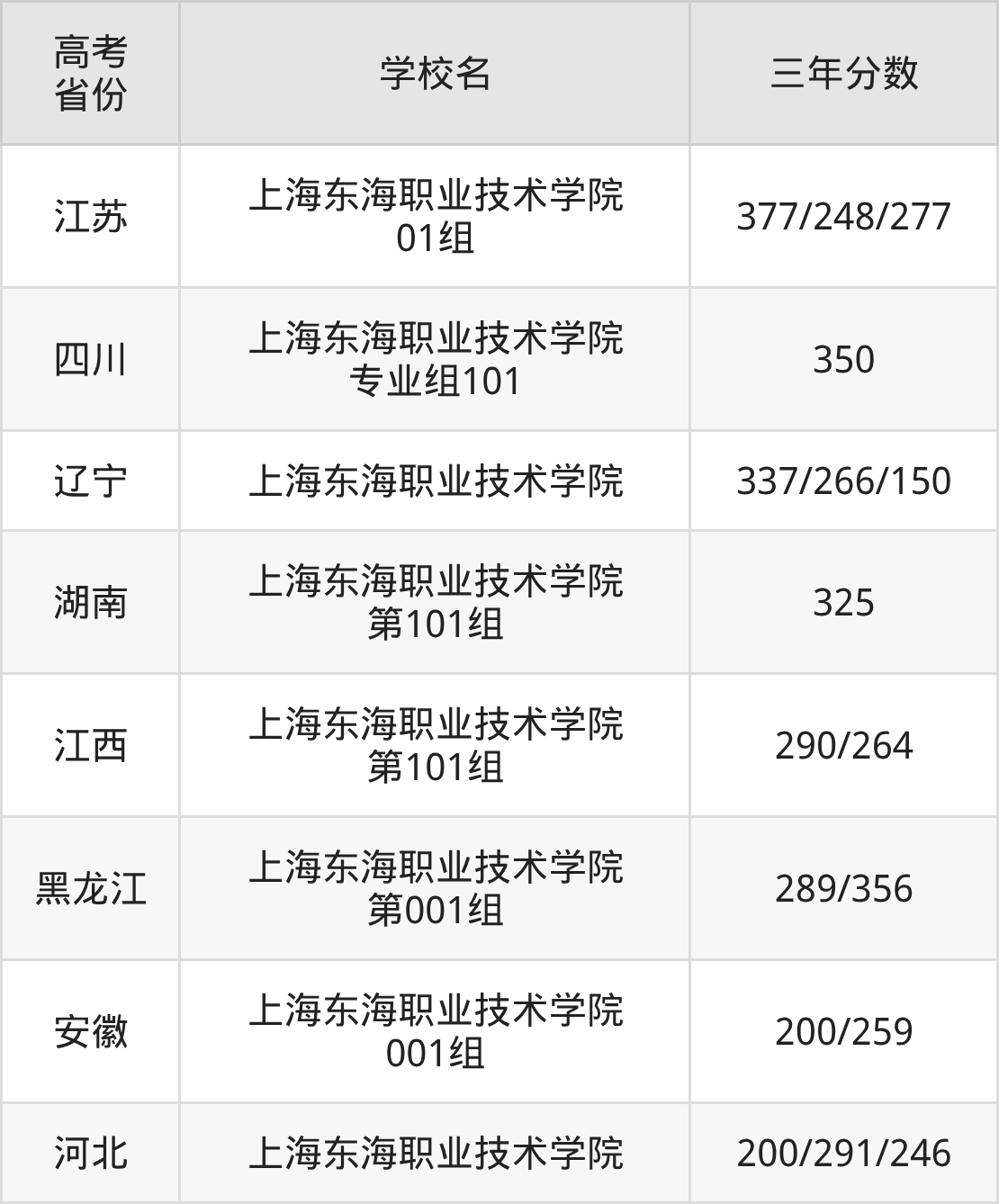 上海东海职业技术学院在全国多省市招生,不同省份录取分数线差异较大,下方表格整合2023-2025年物理类、历史类核心录取数据(分数格式:2025/2024/2023),外地考生可按自身高考省份查找,结合本地位次精准定位。