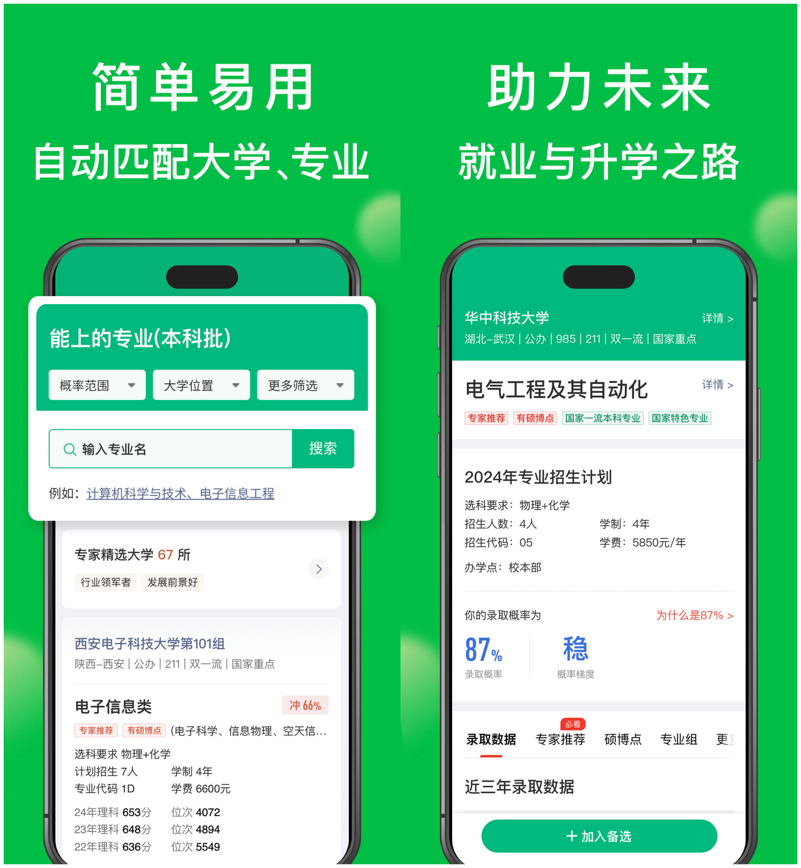 3、录取概率测算:基于历年数据(如位次变化趋势)和当年招生计划(如缩减/扩招),系统能计算个性化录取概率。例如某考生对华中科技大学该专业的87%概率评估,就综合了近三年录取位次和2025年招生计划变化。