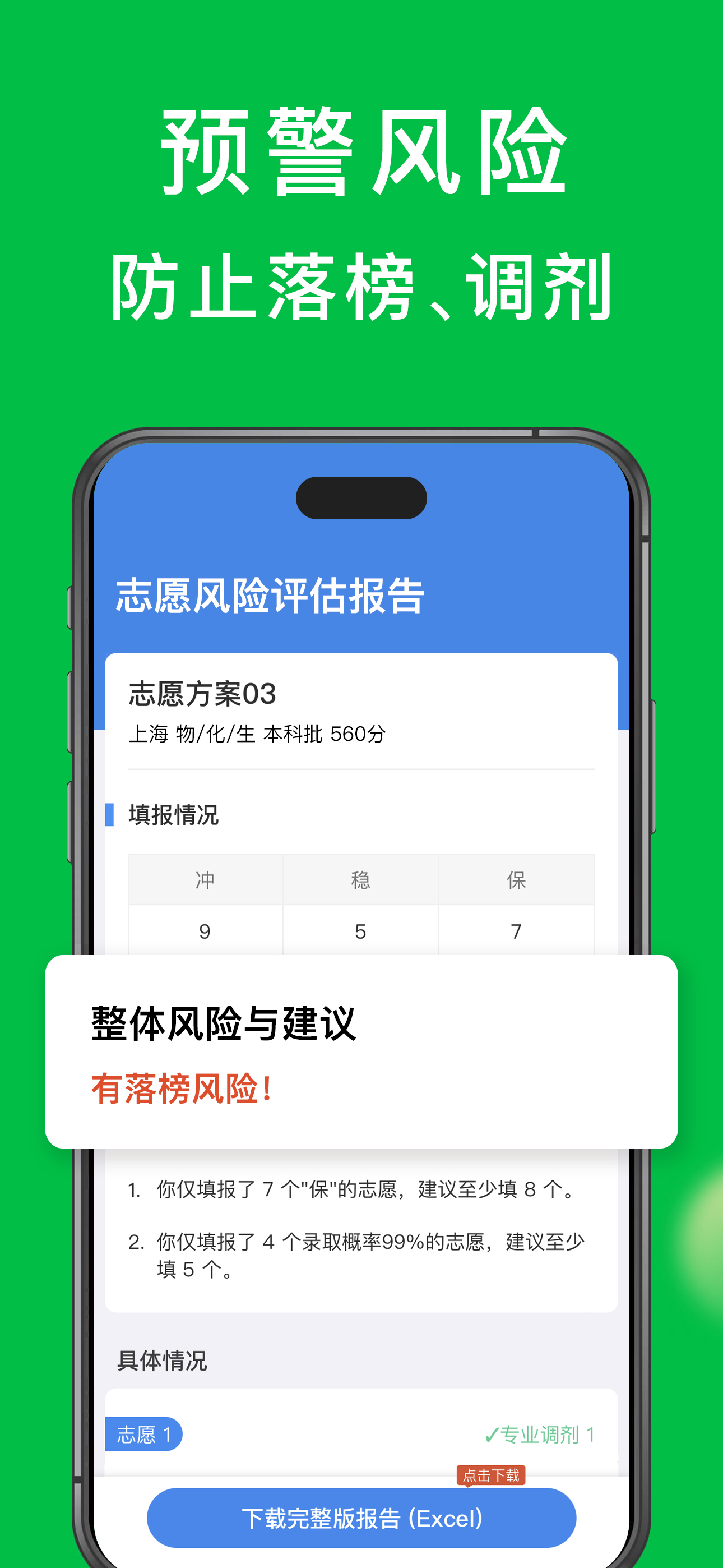 4、个性化建议输出:优秀系统不仅指出问题,还会给出如"增加2个99%概率志愿"等具体优化建议,并支持导出Excel版完整报告供反复研究。