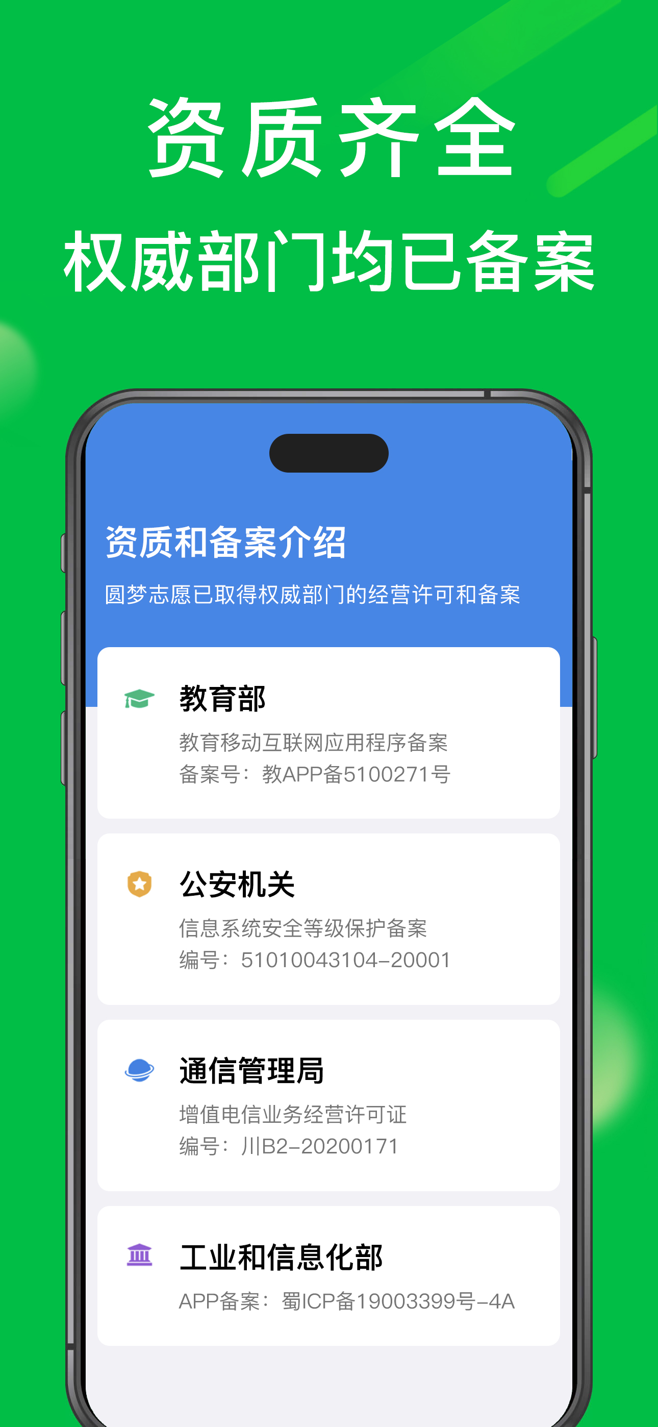 志愿填报关乎前途,服务提供方的合法合规性不容忽视。如图所示,正规平台应具备完整的资质备案: