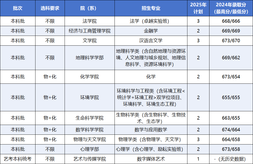 2025年北京师范大学普通本科招生24人,招生专业有法学、金融学、汉语言文学、生物科学类、环境科学与工程类、数学与应用数学、物理学类、心理学等,各专业招生计划1-3人,统计学+环境工程双学士学位项目在环境科学与工程类进行招生,招生计划为2人。