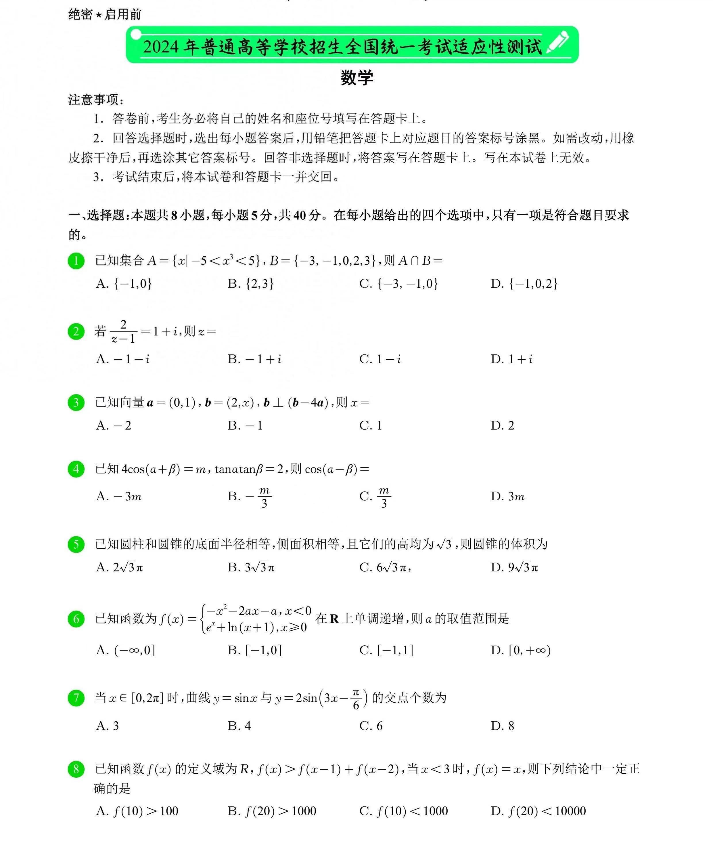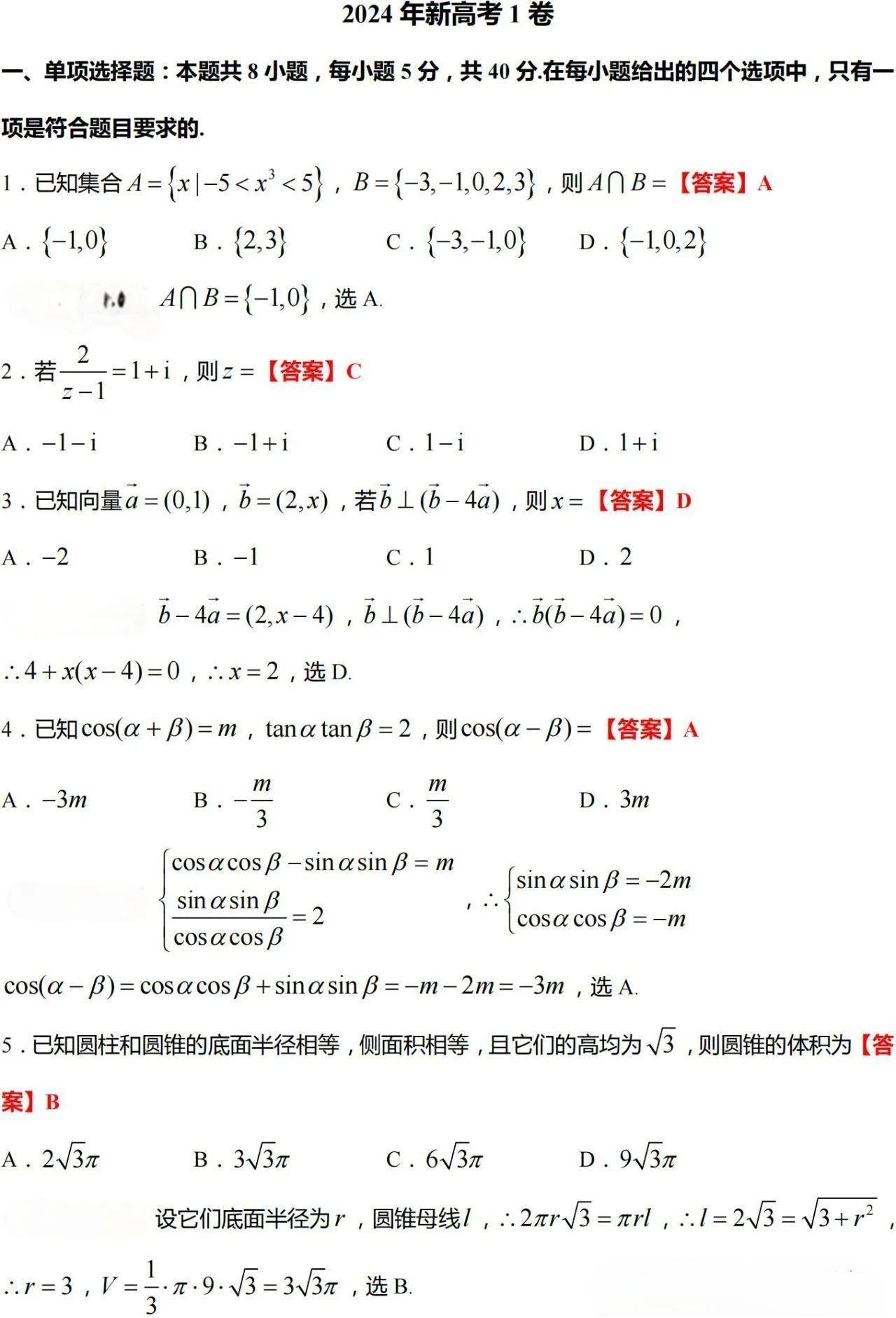 2.2024新高考一卷数学答案及试卷