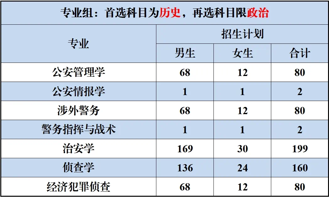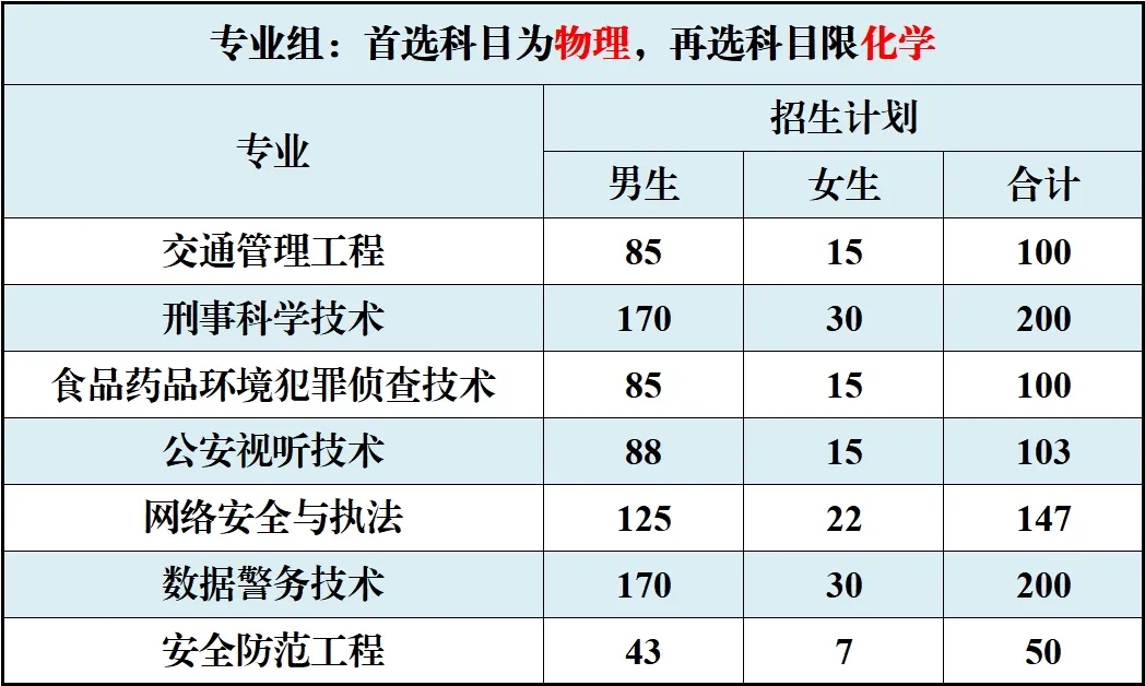 该组别允许选考物理和化学的理科生,报考公安情报学(98人)、警务指挥与战术(98人) 等对逻辑思维和身体素质要求较高的公安学类专业,为有理科背景的指挥型人才提供了培养通道。