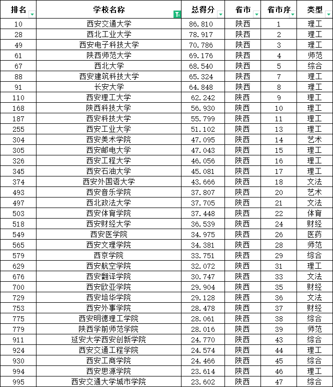 在西安市排名第一的西安交通大学,在全国排名第10名,与软科版本的排名一样!