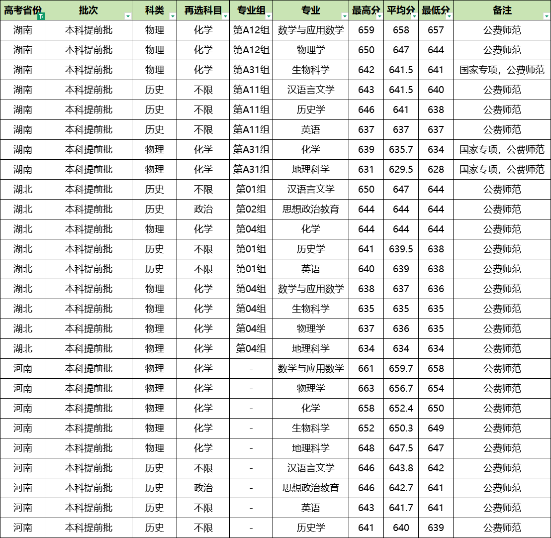 1.河南省:理科专业分数突出,数学与应用数学658分,物理学654分,化学650分;文科汉语言文学642分,整体水平较高。
