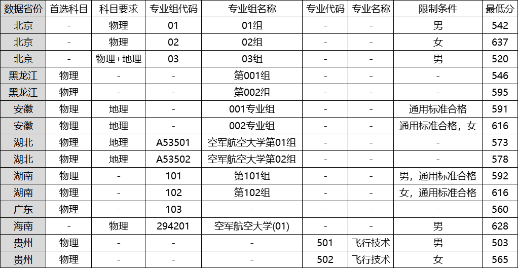 相对低分:贵州男生(飞行技术)503分,但须注意该分数是在通过严格招飞选拔后的文化成绩要求。