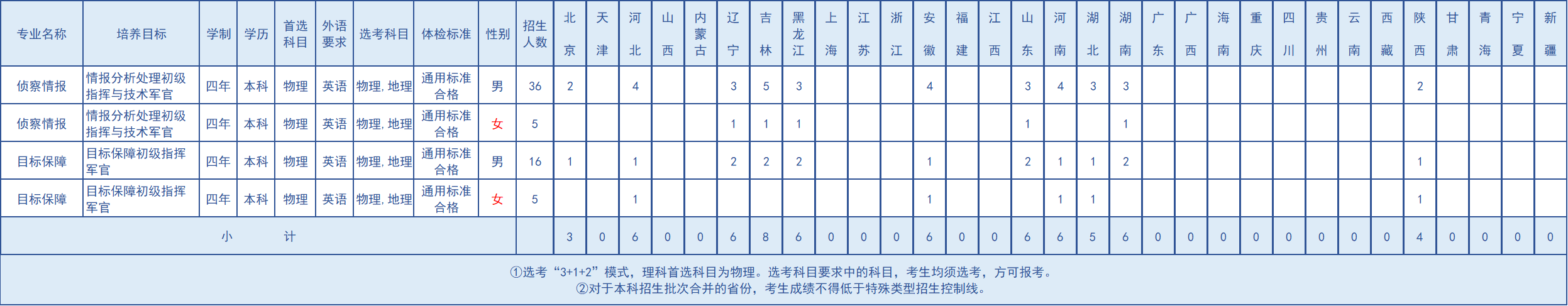 2025年学院计划招收62名生长军官本科青年学员,覆盖全国11个省(直辖市、自治区)。其中男生52人,女生10人。以下是分专业分省招生人数: