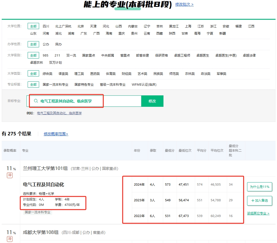 以兰州理工大学电气工程及其自动化专业为例,网站上会显示该专业为国家一流本科专业等信息,同时还会列出2024年的专业招生计划,包括选科要求、招生人数、学制、学费、录取分数线等,为考生提供全面的参考。