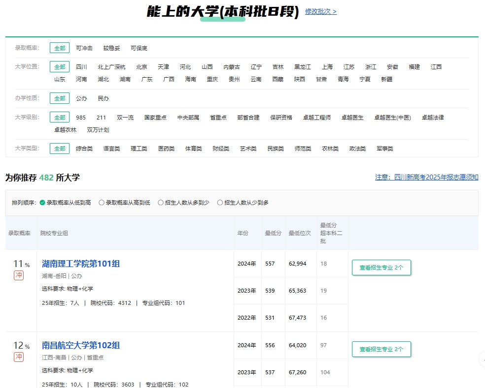 例如,对于四川物化生组合、高考分数为548分的考生,网站能快速筛选出其可能考入的482所大学,其中包含211、双一流等不同层次的院校,让考生对自己的选择范围有清晰的认知。