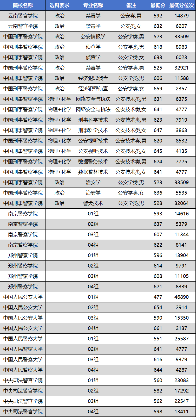 3.院校专业组分数差异大:中国人民公安大学、中国人民警察大学等院校按“专业组”公布数据,不同组别分数跨度巨大。例如,中国人民公安大学01组最低477分,而04组高达661分。这通常意味着不同组别包含了不同选科要求、不同专业类别(如公安学与公安技术)或不同性别计划,考生填报时务必仔细辨别。