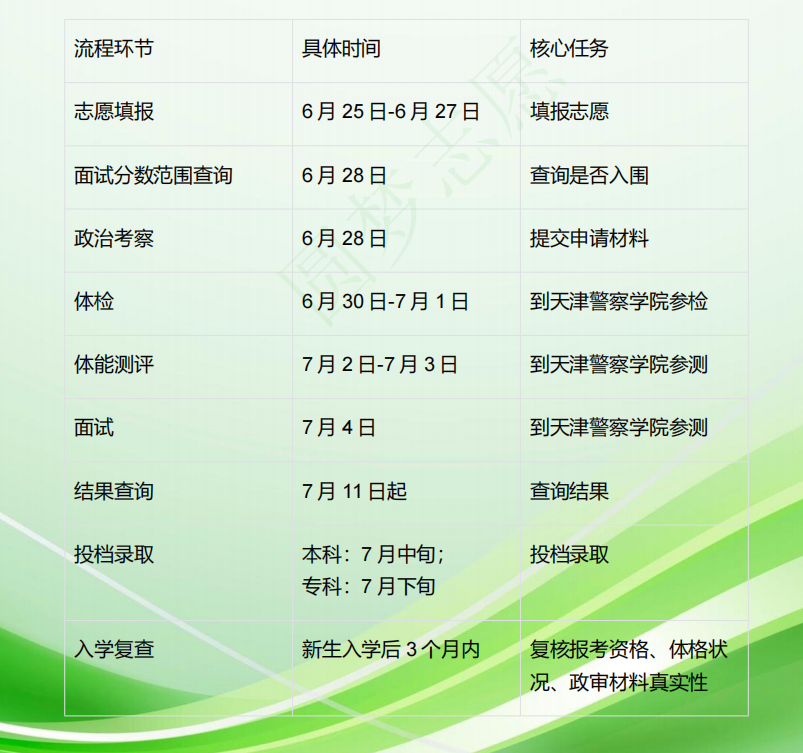 天津市的报考流程在高考后进行,环节紧凑,须密切关注各时间节点。以下时间安排基于2025年情况整理,2026年请以天津市教育招生考试院、天津市公安局官方发布为准。