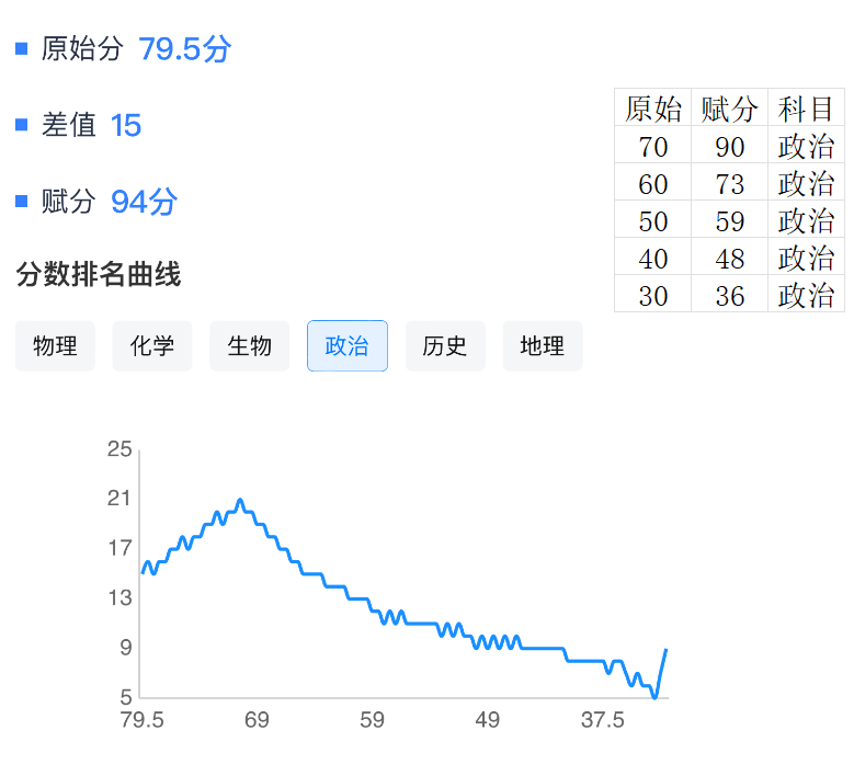 政治原始分79.5分赋分后达94分,差值为15分。原始分70分赋至90分,60分赋至73分,但低分如30分仅赋至36分。政治科目赋分增益高,中分段考生易实现分数“跃升”。
