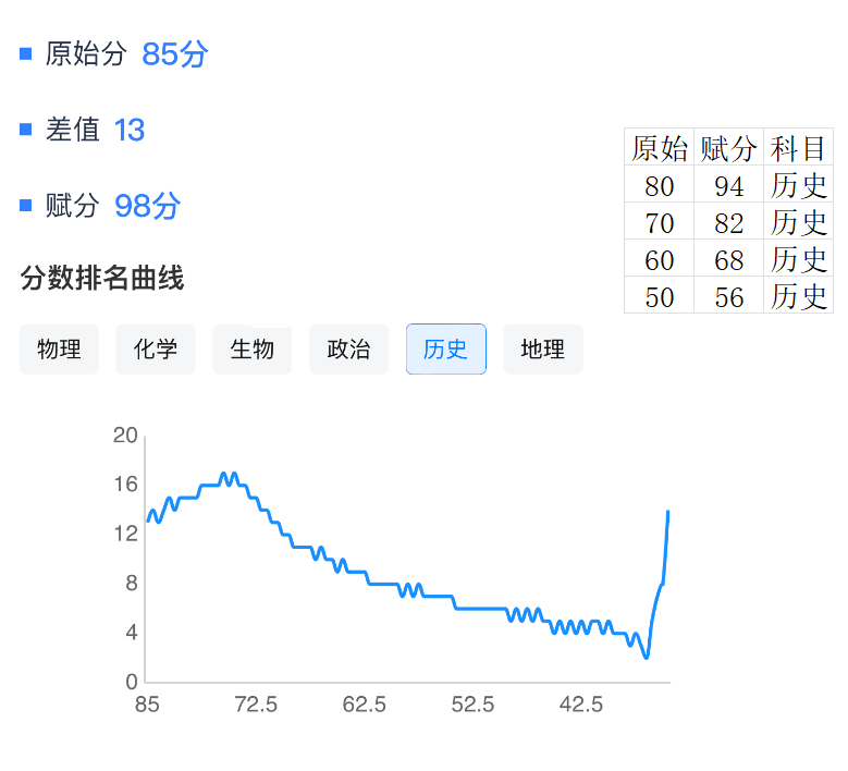 历史原始分85分赋分后为98分,差值为13分。原始分80分赋至94分,70分赋至82分,而50分仅赋至56分。历史赋分曲线较平缓,适合文科生稳中求进。