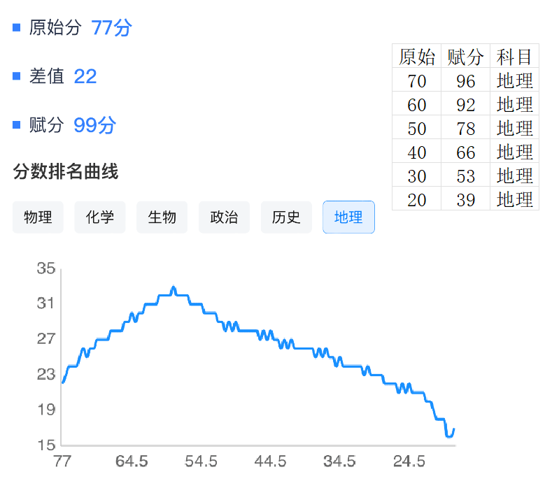 地理原始分77分赋分后达99分,差值为22分。原始分70分可赋至96分,60分赋至92分,但20分仅赋至39分。地理赋分幅度大,低原始分考生也有机会获得较高赋分。