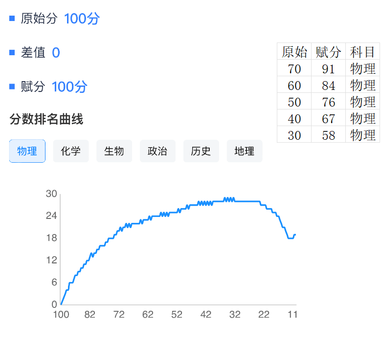 物理原始分100分可直接赋满100分,差值为0。这表明高分段考生集中,满分竞争激烈。例如,原始分70分可赋至91分,而30分仅赋至58分,凸显了高分区间的优势。