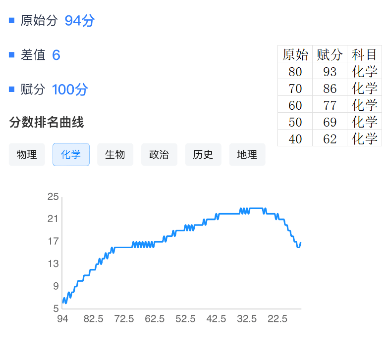 化学原始分94分赋分后达100分,差值为6分。原始分80分赋至93分,70分赋至86分,但低分如40分仅赋至62分。这反映出化学试题难度较大,中高分段考生赋分收益显著。