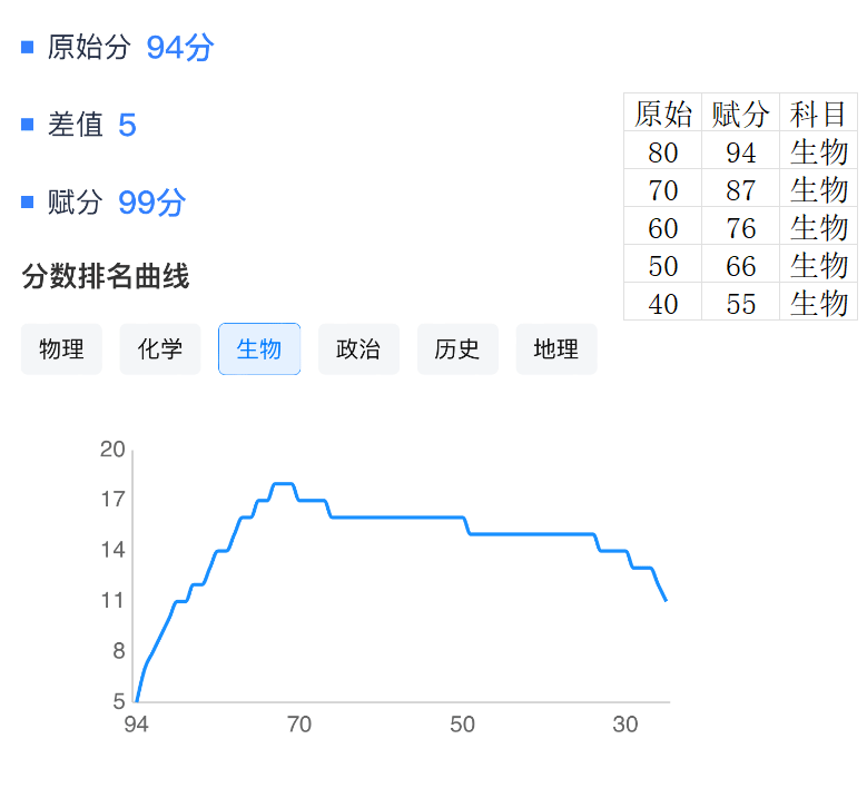 生物原始分94分赋分后为99分,差值为5分。原始分80分可赋至94分,70分赋至87分,而40分仅赋至55分。生物赋分整体平稳,适合基础扎实的考生冲刺高分。
