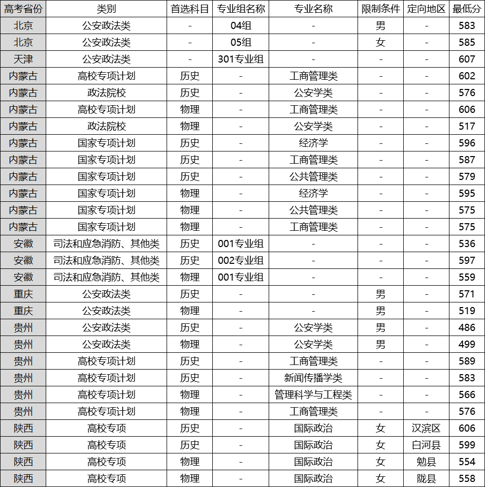 2.性别限制:公安学类等专业明确仅招收男生,如北京、重庆、贵州等地;