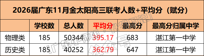 物理类方面,参考总人数 50344 人(覆盖 1127 个班级),赋分总分最高 683 分(归属湛江第一中学),总分平均分为 395.17 分;校均分前三的学校是湛江第一中学(550.98 分)、广州市黄广中学(516.51 分)、梅县外国语学校(513.80 分)。