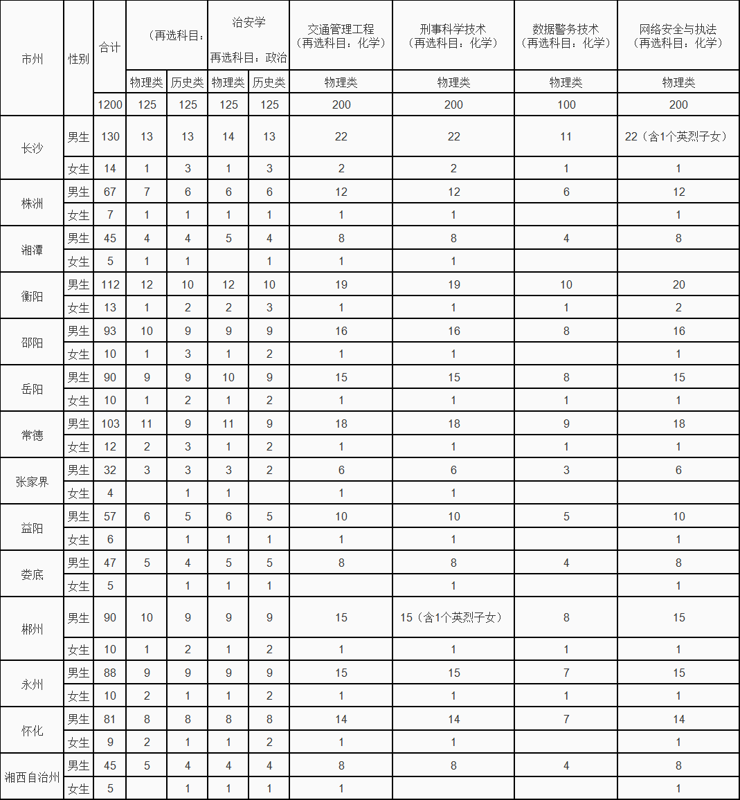 湖南警察学院(公安专业)2025年共招1200人,招生专业包含了侦查学、治安学、交通管理工程、刑事科学技术、数据警务技术、网络安全与执法。