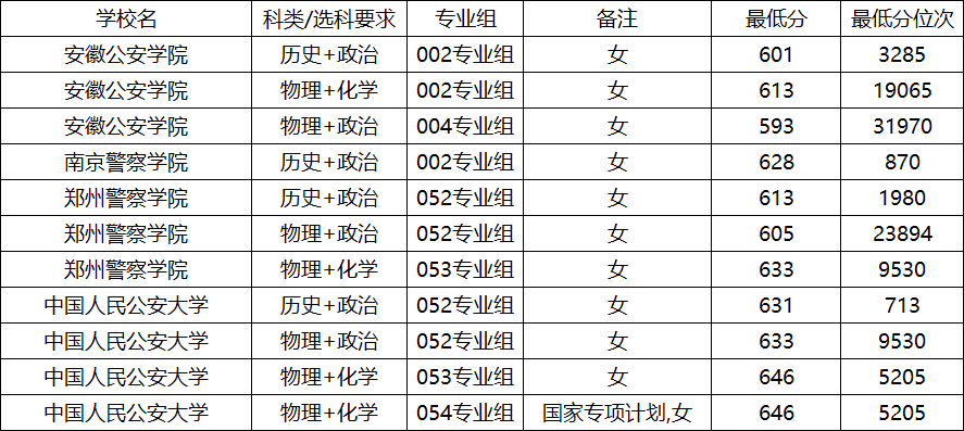 刑事科学技术(物理+化学)(公安技术类,女):最低642分、位次是6404