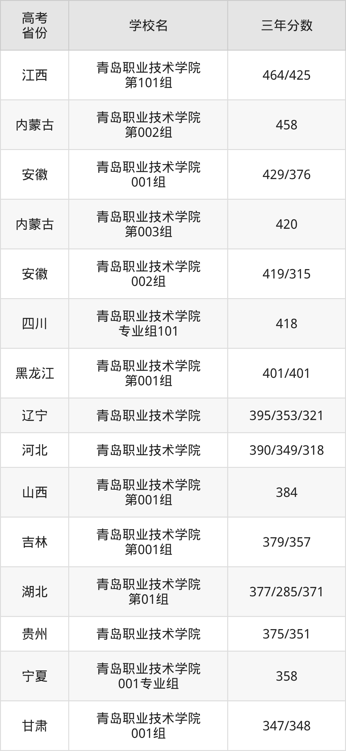 | 河北 | 青岛职业技术学院 | 451/433/423 |